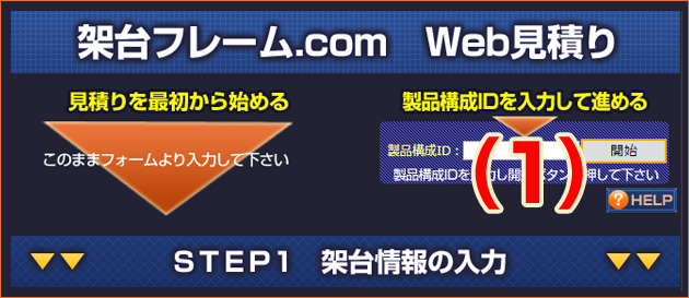 「Web見積り」の冒頭に表示される以下の画面の右側(1)部分は、「製品構成ID」をお持ちで途中保存状態から再開したい方のための入力欄です。