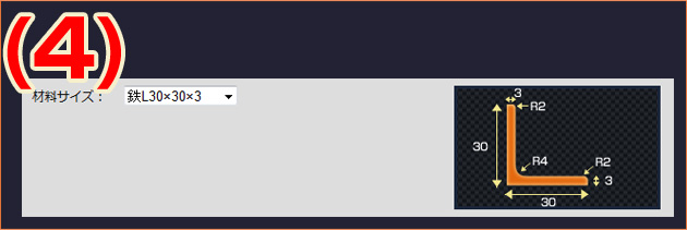選択肢中の各数値は使用アングル材料の「1辺×1辺×板厚」の各長さとなります。