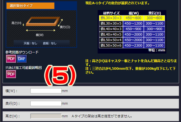 (5)入力項目では各架台のサイズを入力して下さい。入力値はミリメートル単位(整数のみ)となります。