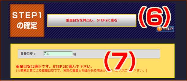 (7)のように、「重量目安は適正です。STEP2に進んで下さい。」