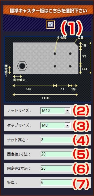 (1)取り付けるキャスター板が、記載の標準寸法でよろしければこちらをチェックして下さい。標準寸法の場合は、架台のタイプ・材料によって、ナットサイズ、タップサイズ、各寸法は指定値(固定値)となります。