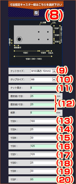 寸法指定キャスターを選択される場合は、以下図中(8)にチェックを入れて下さい。