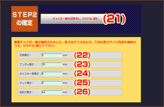STEP2を確定させるための、キャスター板サイズ計算、架台の最終的な高さを計算するボタンです。