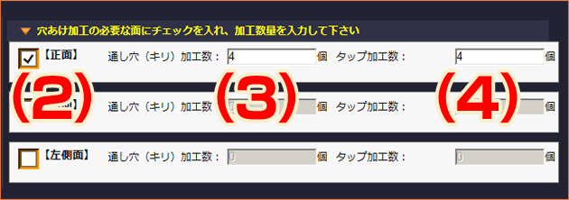 (2)穴あけ加工が必要な場合は、穴あけの必要な面にチェックを入れて下さい。