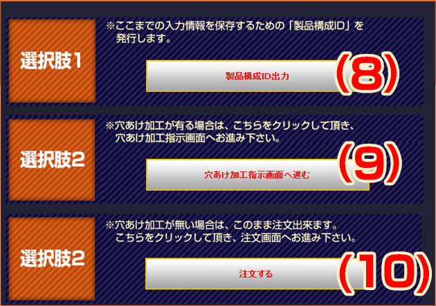 入力内容をご確認の上、『穴あけ加工指示画面へ進む』もしくは『注文する』をクリックして下さい。
